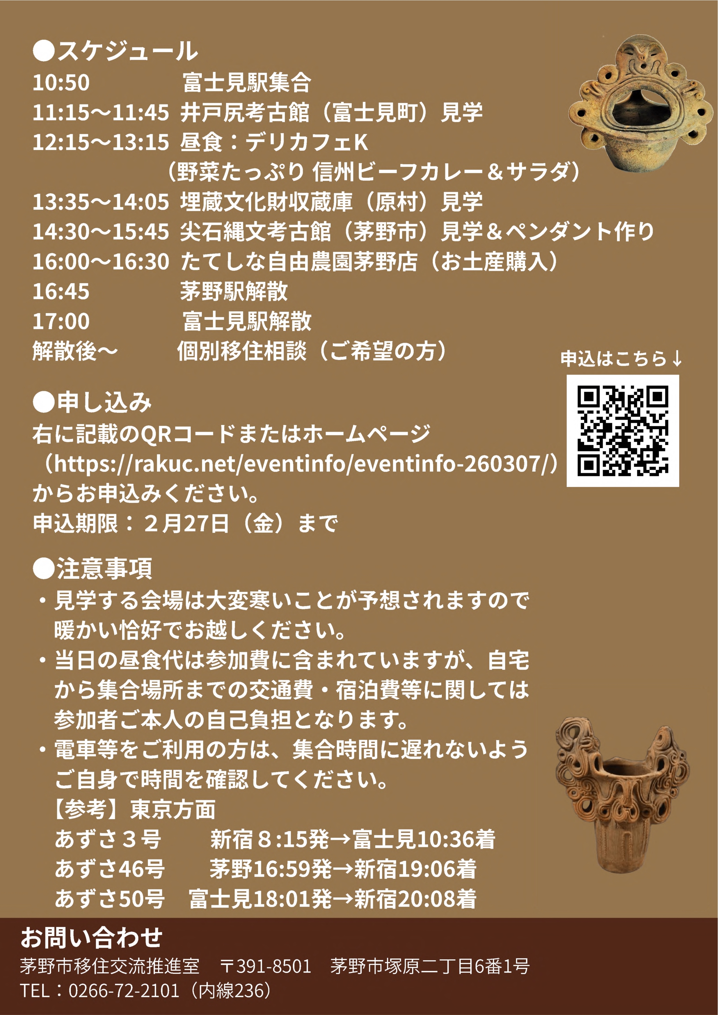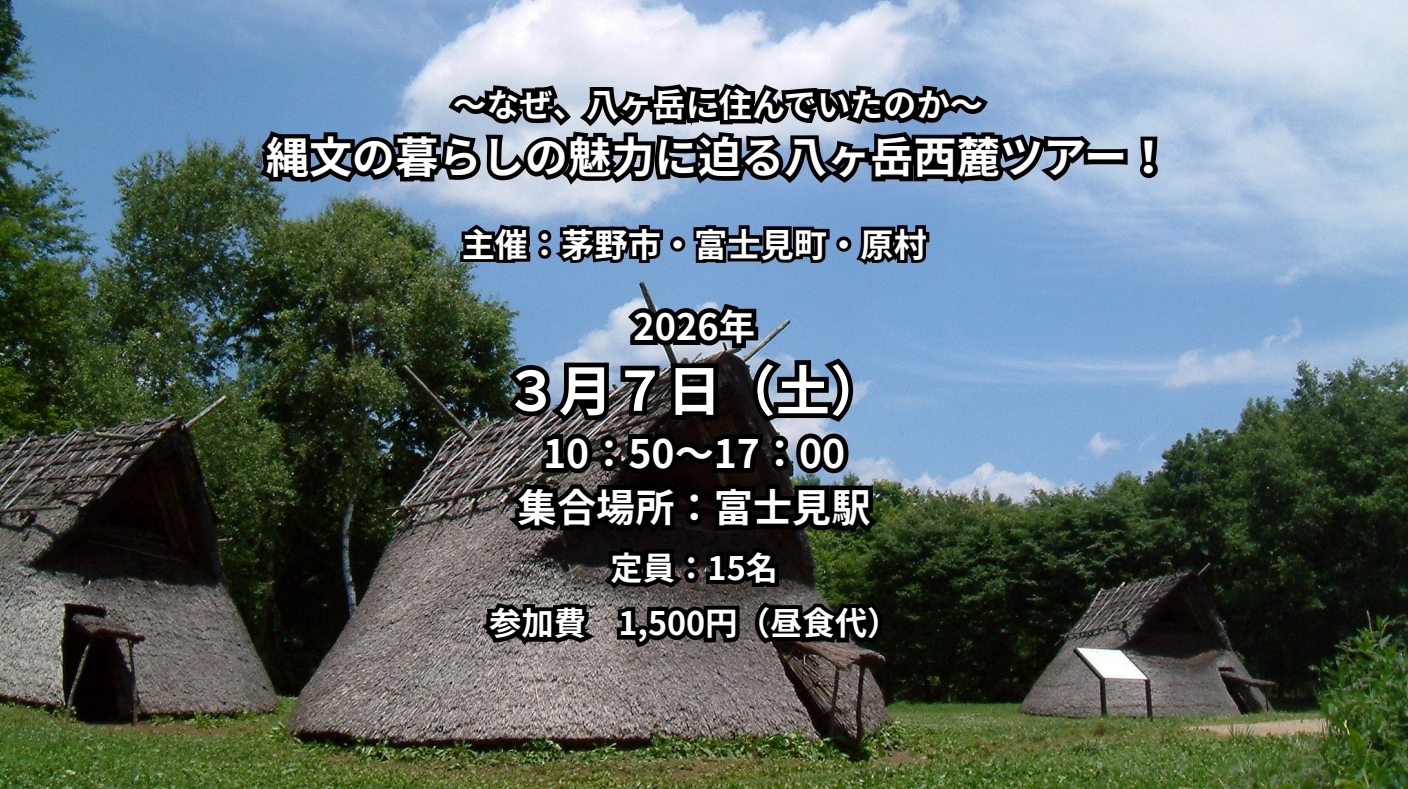 井戸尻考古館(富士見町)、埋蔵文化財収蔵庫(原村)、尖石縄文考古館(茅野市)を巡りながら、八ヶ岳西麓ならではの縄文の暮らしと、今でも受け継がれている魅力に迫ります。