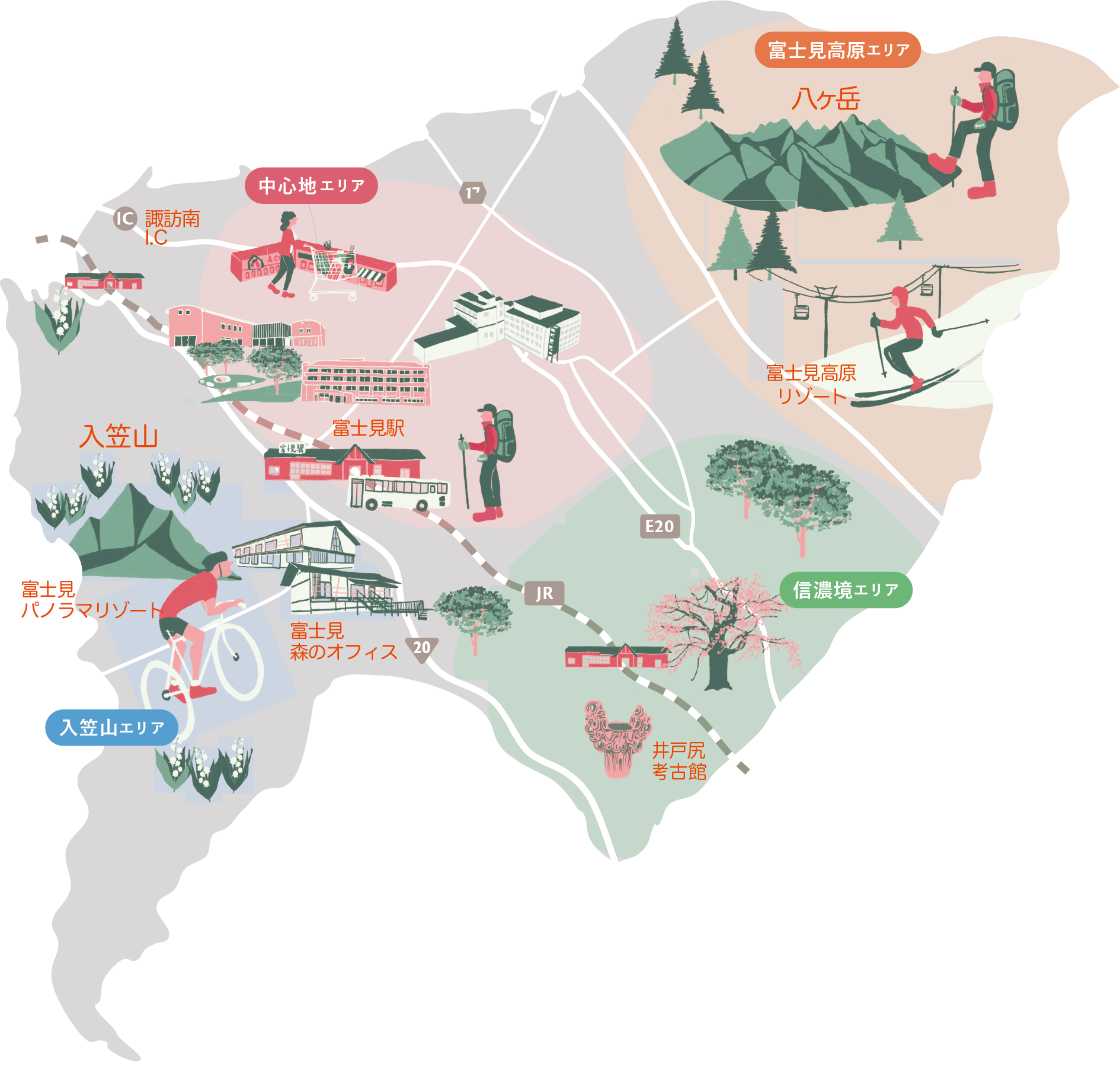 生活圏の標高は700~1,200m、年平均気温が10℃程度。夏は冷涼な気候で避暑地になり、冬は寒いですが、太陽光が降り注ぐ高い晴天率を誇ります。 八ヶ岳や南アルプス、富士山を眺めながら、四季折々の景色が楽しめます。周辺にはペンションや別荘地が多く、週末には多くの利用者でにぎわいます。