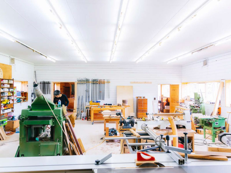 ⼯場には家具作りに必要な道具が所狭しと並ぶ