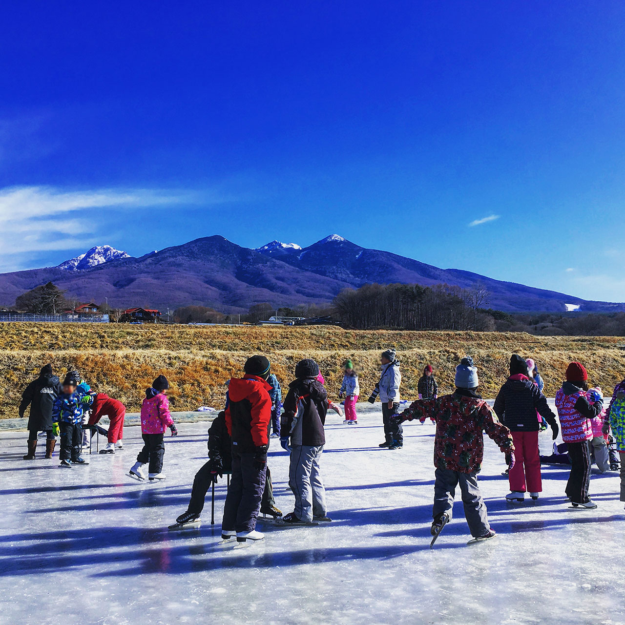 背後からは大きく雄大な八ヶ岳が見守り、スケート場に立つと目の前には南アルプスの山々が広がるそんな贅沢なスケート場では、氷点下の寒さにもかかわらず元気に滑る子どもたちの笑い声が響き渡っています。