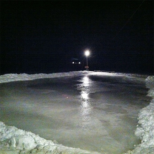 標高1000mの冬ですから、夜はマイナス10度にもなります。そんな寒さの中でまいた水が朝になると凍り、それを何回か繰り返すと、やっとスケートで滑られるような平らな氷ができあがります。