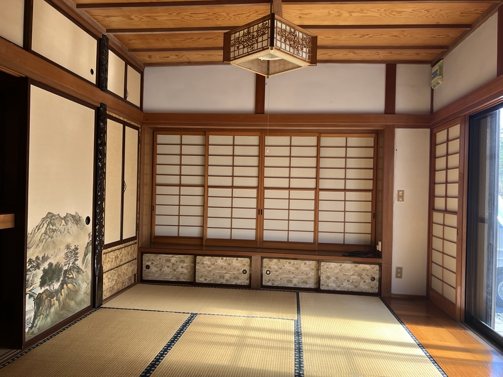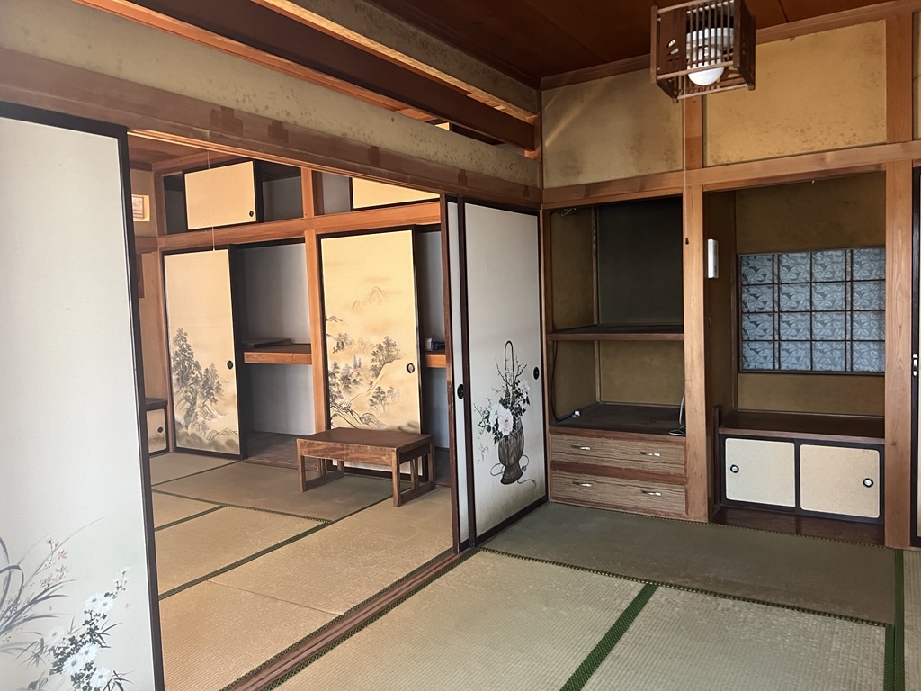 どの部屋にも庭に面し光と緑を感じることができる珍しい間取りです。玄関も2つあり、離れにお風呂があります。和室が5室、納戸や押し入れが各部屋あるため収納力は抜群。