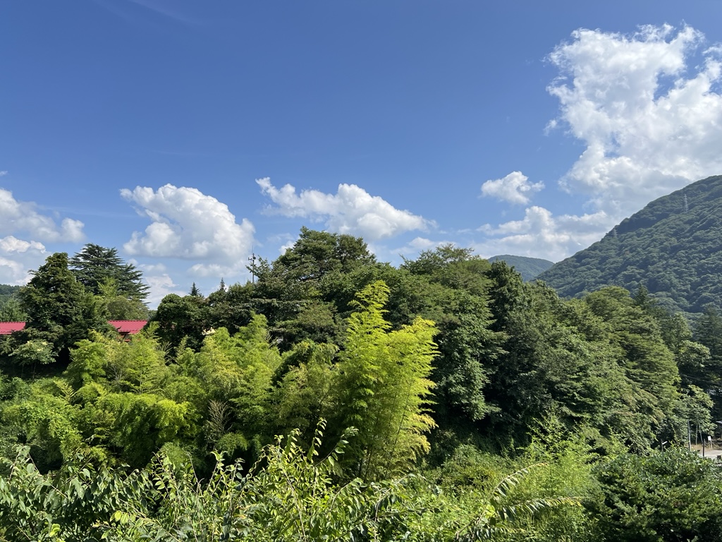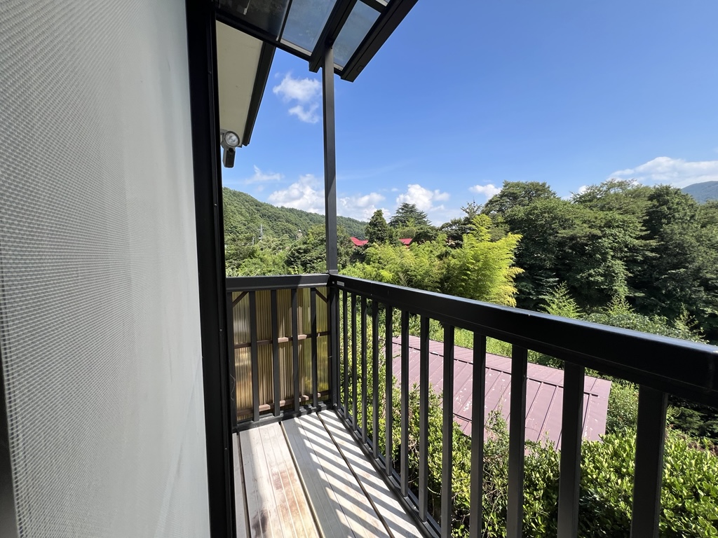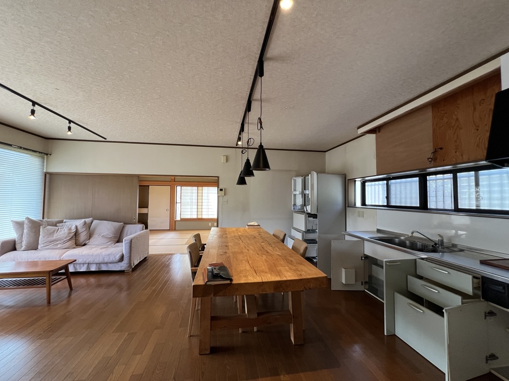 自然素材を使い外の景観と室内が一体化した設計になっており、ソファーに座ると目の前は森が広がるパノラマビュー。風通しも良くクーラーなしでも生活ができます(但し、クーラーが必要な場合は応相談で取り付け可能)ダイニングを中心に和室や水回りに続きます。冷蔵庫や大型TVもあります(撤去可能)